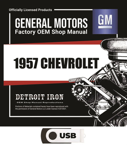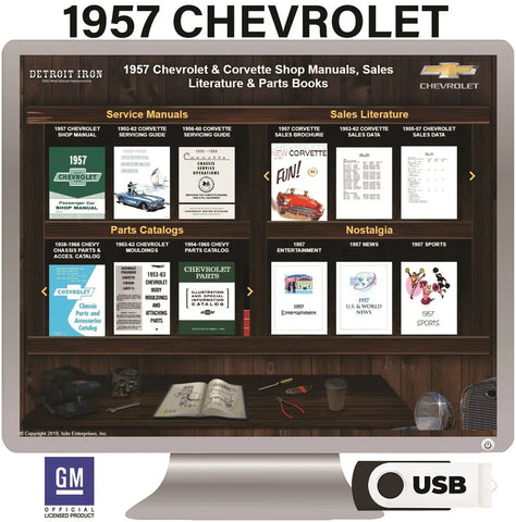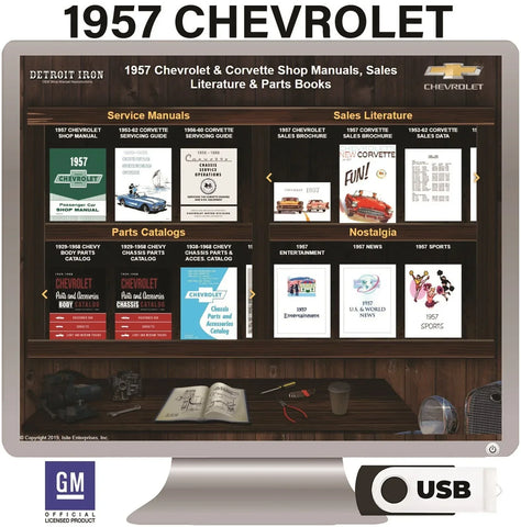 The 1957 Chevrolet & Corvette Shop Manuals, Sales Literature & Parts Books on USB is a digital product published by Detroit Iron and licensed by GM. This Detroit Iron digital product provides a full set of original equipment manufacturer (OEM) repair and rebuild literature in digital / PDF format. This set of manuals and literature were originally authored and published by the car / truck manufacturer to be used by their dealership mechanics so they are very comprehensive. It features an easy-to-use bookcase in a garage scene containing a set of PDF manuals, catalogs, brochures and nostalgia for a specific year, make and model range.