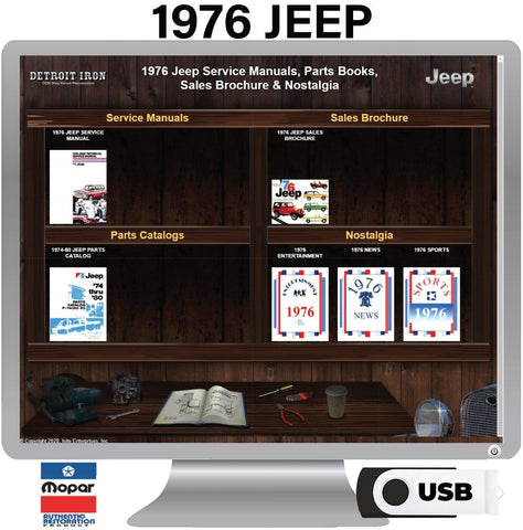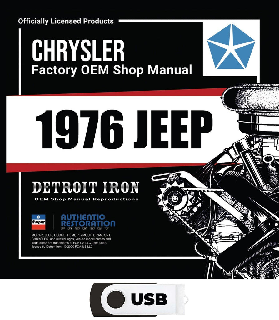 The 1976 Jeep Shop Manual, Parts Book & Sales Brochure on USB is a digital product published by Detroit Iron and licensed by Chrysler. This Detroit Iron digital product provides a full set of original equipment manufacturer (OEM) repair and rebuild literature in digital / PDF format. This set of manuals and literature were originally authored and published by the car / truck manufacturer to be used by their dealership mechanics so they are very comprehensive. It features an easy-to-use bookcase in a garage scene containing a set of PDF manuals, catalogs, brochures and nostalgia for a specific year, make and model range.