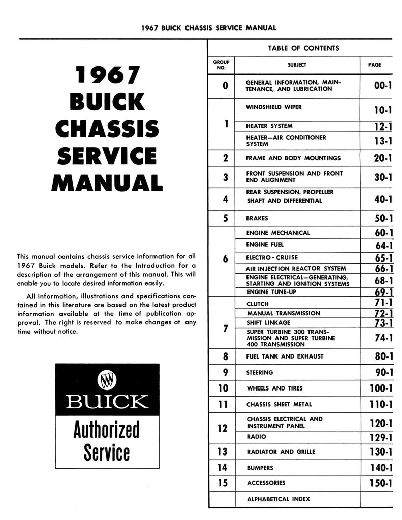 With the 1967 Buick Chassis Service Manual - All Series in your toolbox, you have the most comprehensive literature at your fingertips to take on the most challenging repair, service and restoration projects. This factory written Detroit Iron shop manual is perfect for the restorer or anyone working on one of these vehicles.