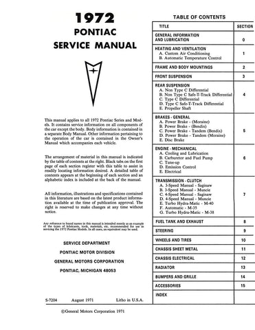 With the 1972 Pontiac Service Manual in your toolbox, you have the most comprehensive literature at your fingertips to take on the most challenging repair, service and restoration projects. This factory written Detroit Iron shop manual is perfect for the restorer or anyone working on one of these vehicles.