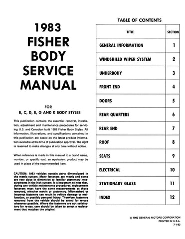 With the 1983 Fisher Body B-C-D-E-G-K Service Manual in your toolbox, you have the most comprehensive literature at your fingertips to take on the most challenging repair, service and restoration projects. This factory written Detroit Iron shop manual is perfect for the restorer or anyone working on one of these vehicles.
