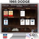 The 1965 Dodge Shop Manuals, Sales Data & Parts Book on CD is a digital product published by Detroit Iron and licensed by Chrysler. This Detroit Iron digital product provides a full set of original equipment manufacturer (OEM) repair and rebuild literature in digital / PDF format. This set of manuals and literature were originally authored and published by the car / truck manufacturer to be used by their dealership mechanics so they are very comprehensive. It features an easy-to-use bookcase in a garage scene containing a set of PDF manuals, catalogs, brochures and nostalgia for a specific year, make and model range.