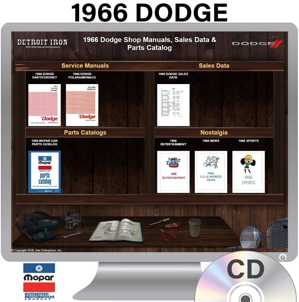 The 1966 Dodge Shop Manuals, Sales Data & Parts Catalog on CD is a digital product published by Detroit Iron and licensed by Chrysler. This Detroit Iron digital product provides a full set of original equipment manufacturer (OEM) repair and rebuild literature in digital / PDF format. This set of manuals and literature were originally authored and published by the car / truck manufacturer to be used by their dealership mechanics so they are very comprehensive. It features an easy-to-use bookcase in a garage scene containing a set of PDF manuals, catalogs, brochures and nostalgia for a specific year, make and model range.