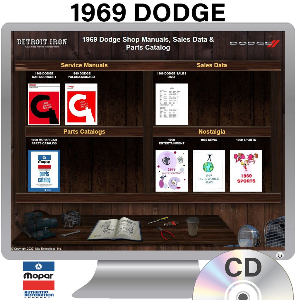 The 1969 Dodge Shop Manuals, Sales Data & Parts Book on CD is a digital product published by Detroit Iron and licensed by Chrysler. This Detroit Iron digital product provides a full set of original equipment manufacturer (OEM) repair and rebuild literature in digital / PDF format. This set of manuals and literature were originally authored and published by the car / truck manufacturer to be used by their dealership mechanics so they are very comprehensive. It features an easy-to-use bookcase in a garage scene containing a set of PDF manuals, catalogs, brochures and nostalgia for a specific year, make and model range.