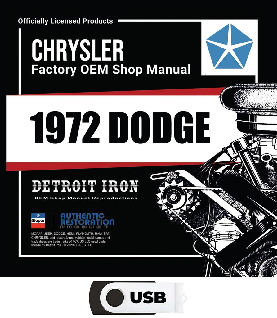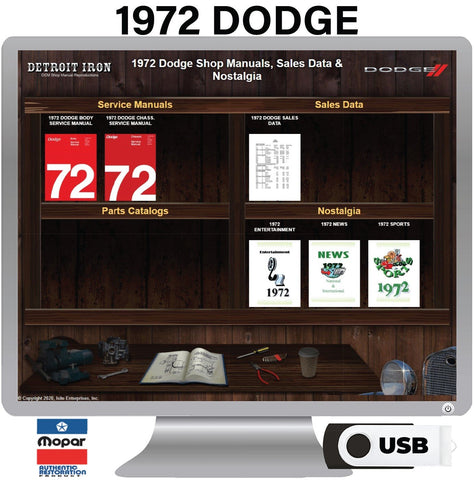 The 1972 Dodge Shop Manuals & Sales Data on USB is a digital product published by Detroit Iron and licensed by Chrysler. This Detroit Iron digital product provides a full set of original equipment manufacturer (OEM) repair and rebuild literature in digital / PDF format. This set of manuals and literature were originally authored and published by the car / truck manufacturer to be used by their dealership mechanics so they are very comprehensive. It features an easy-to-use bookcase in a garage scene containing a set of PDF manuals, catalogs, brochures and nostalgia for a specific year, make and model range.