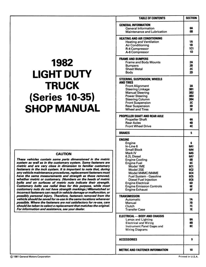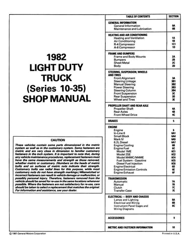 With the 1982 Chevy LD Truck 10-30 Series Shop Manual in your toolbox, you have the most comprehensive literature at your fingertips to take on the most challenging repair, service and restoration projects. This factory written Detroit Iron shop manual is perfect for the restorer or anyone working on one of these vehicles.