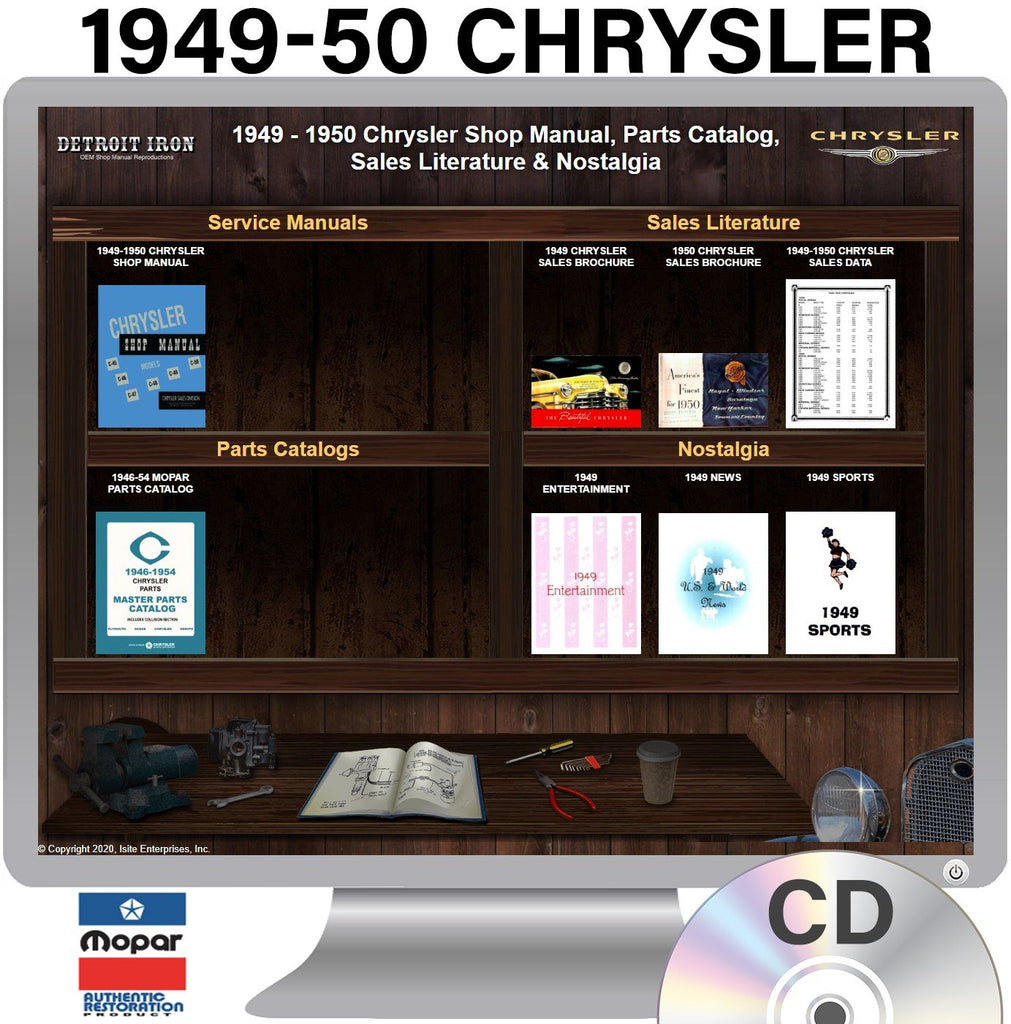 The 1949-1950 Chrysler Shop Manual, Parts Catalog & Sales Literature on CD is a digital product published by Detroit Iron and licensed by Chrysler. This Detroit Iron digital product provides a full set of original equipment manufacturer (OEM) repair and rebuild literature in digital / PDF format. This set of manuals and literature were originally authored and published by the car / truck manufacturer to be used by their dealership mechanics so they are very comprehensive. It features an easy-to-use bookcase in a garage scene containing a set of PDF manuals, catalogs, brochures and nostalgia for a specific year, make and model range.