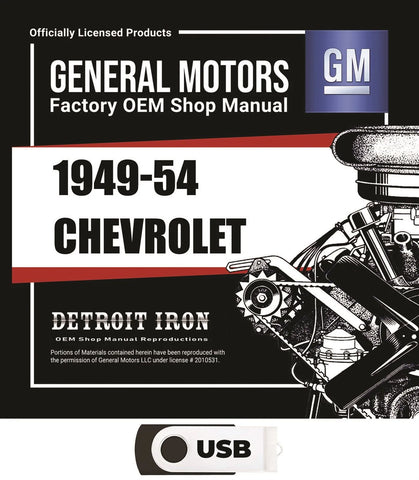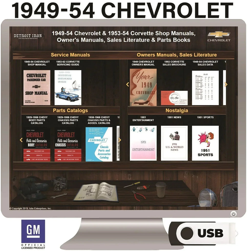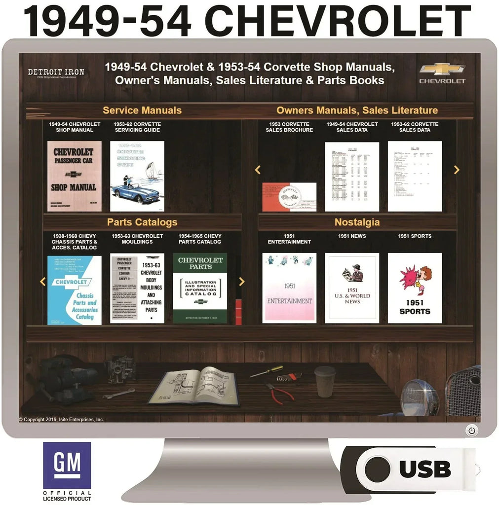 The 1949-1954 Chevrolet & 1953-1954 Corvette Shop Manuals, Sales Literature & Parts Books on USB is a digital product published by Detroit Iron and licensed by GM. This Detroit Iron digital product provides a full set of original equipment manufacturer (OEM) repair and rebuild literature in digital / PDF format. This set of manuals and literature were originally authored and published by the car / truck manufacturer to be used by their dealership mechanics so they are very comprehensive. It features an easy-to-use bookcase in a garage scene containing a set of PDF manuals, catalogs, brochures and nostalgia for a specific year, make and model range.