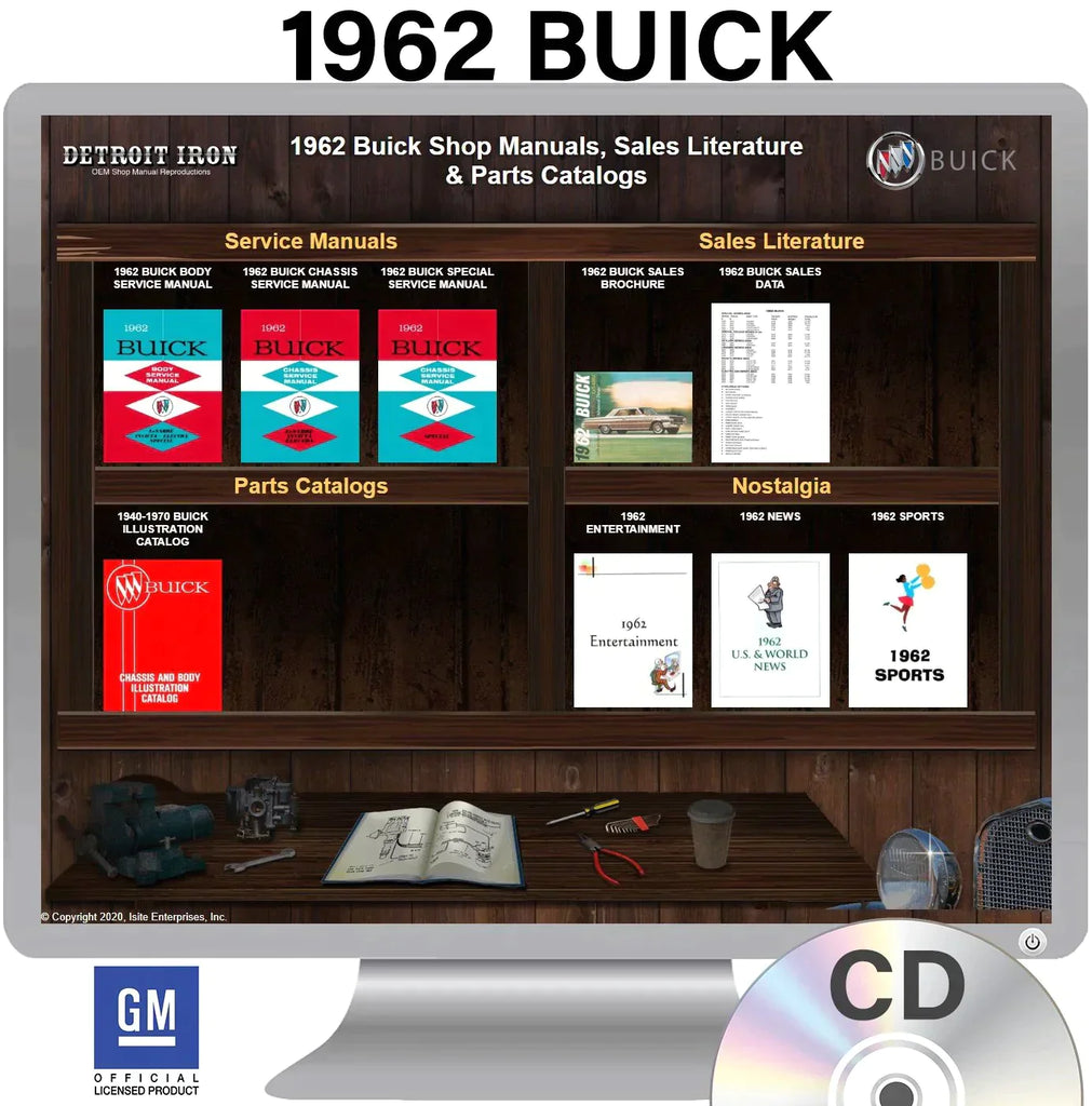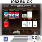 The 1962 Buick Shop Manuals, Sales Literature & Parts Book on CD is a digital product published by Detroit Iron and licensed by GM. This Detroit Iron digital product provides a full set of original equipment manufacturer (OEM) repair and rebuild literature in digital / PDF format. This set of manuals and literature were originally authored and published by the car / truck manufacturer to be used by their dealership mechanics so they are very comprehensive. It features an easy-to-use bookcase in a garage scene containing a seto of PDF manuals, catalogs, brochures and nostalgia for a specific year, make and model range.