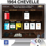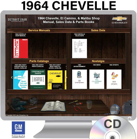The 1964 Chevelle / El Camino / Malibu Shop Manual, Sales Data & Parts Books on CD is a digital product published by Detroit Iron and licensed by GM. This Detroit Iron digital product provides a full set of original equipment manufacturer (OEM) repair and rebuild literature in digital / PDF format. This set of manuals and literature were originally authored and published by the car / truck manufacturer to be used by their dealership mechanics so they are very comprehensive. It features an easy-to-use bookcase in a garage scene containing a seto of PDF manuals, catalogs, brochures and nostalgia for a specific year, make and model range.