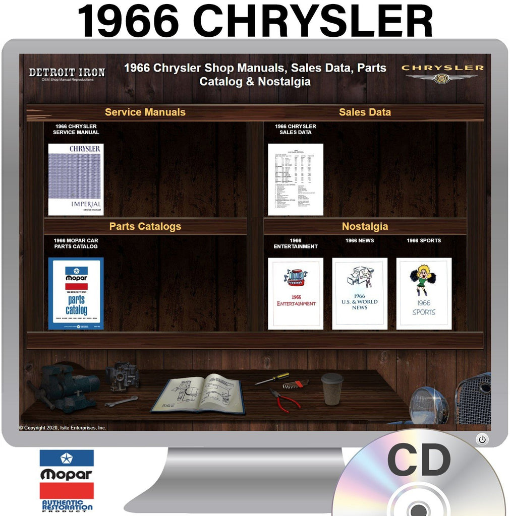 The 1966 Chrysler Shop Manual, Sales Data and Parts Book on CD is a digital product published by Detroit Iron and licensed by Chrysler. This Detroit Iron digital product provides a full set of original equipment manufacturer (OEM) repair and rebuild literature in digital / PDF format. This set of manuals and literature were originally authored and published by the car / truck manufacturer to be used by their dealership mechanics so they are very comprehensive. It features an easy-to-use bookcase in a garage scene containing a set of PDF manuals, catalogs, brochures and nostalgia for a specific year, make and model range.