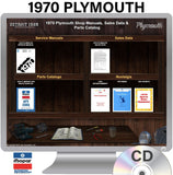 The 1970 Plymouth Shop Manual, Sales Data & Parts Book on CD is a digital product published by Detroit Iron and licensed by Chrysler. This Detroit Iron digital product provides a full set of original equipment manufacturer (OEM) repair and rebuild literature in digital / PDF format. This set of manuals and literature were originally authored and published by the car / truck manufacturer to be used by their dealership mechanics so they are very comprehensive. It features an easy-to-use bookcase in a garage scene containing a set of PDF manuals, catalogs, brochures and nostalgia for a specific year, make and model range.