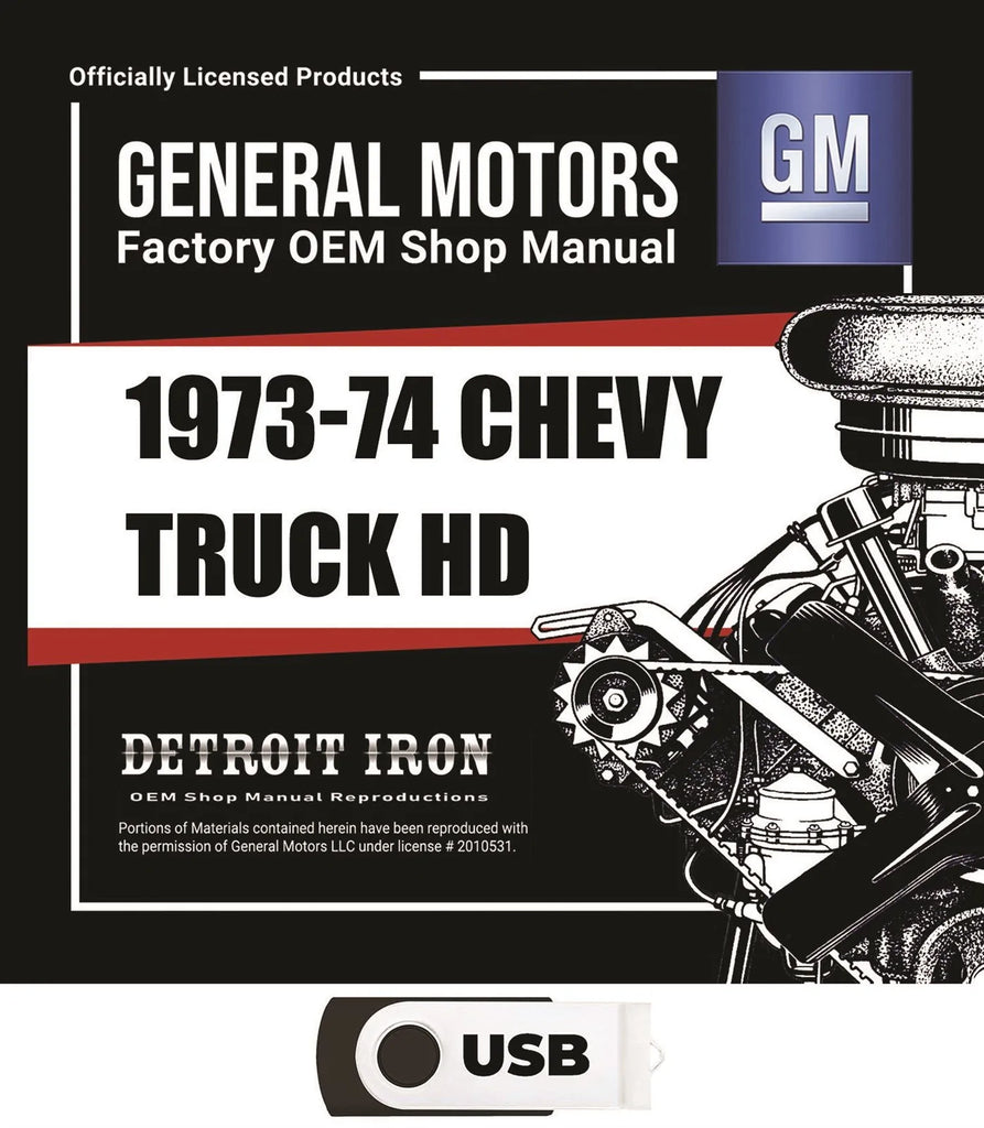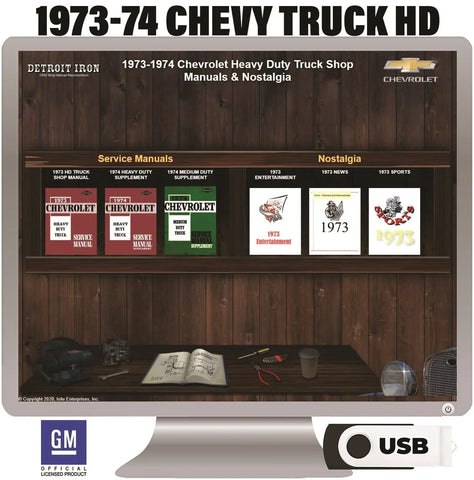 The 1973-1974 Chevrolet Medium / Heavy Truck Duty Shop Manuals on USB is a digital product published by Detroit Iron and licensed by GM. This Detroit Iron digital product provides a full set of original equipment manufacturer (OEM) repair and rebuild literature in digital / PDF format. This set of manuals and literature were originally authored and published by the car / truck manufacturer to be used by their dealership mechanics so they are very comprehensive. It features an easy-to-use bookcase in a garage scene containing a set of PDF manuals, catalogs, brochures and nostalgia for a specific year, make and model range.