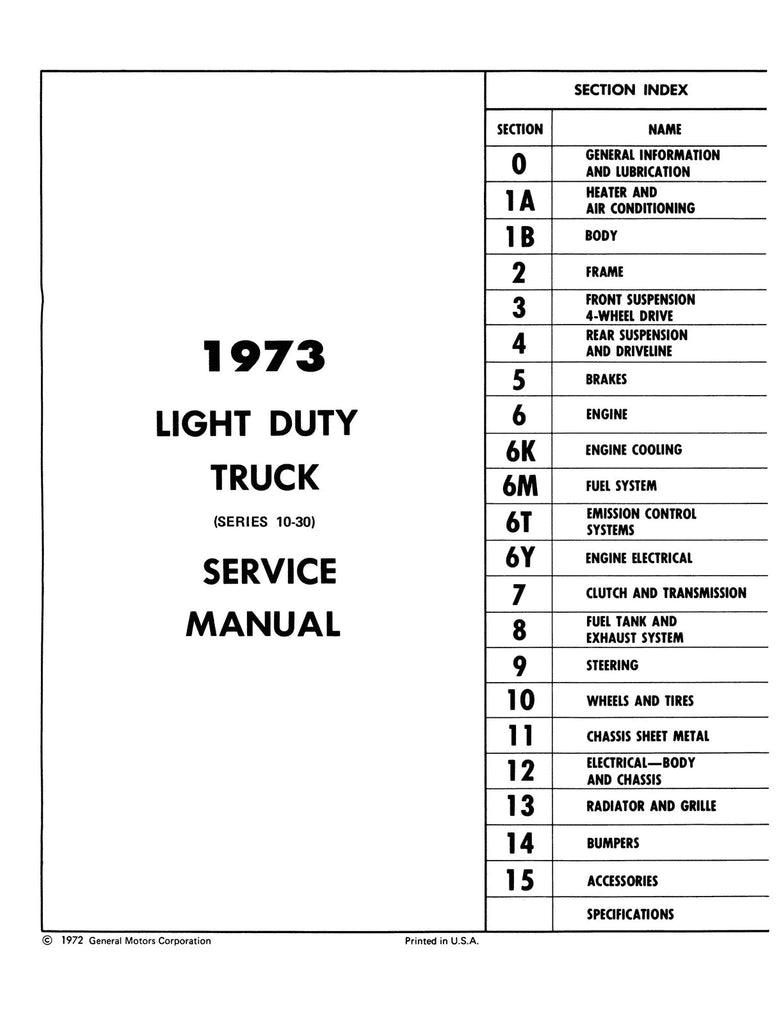 With the 1973 Chevrolet Light Duty Truck Service Manual in your toolbox, you have the most comprehensive literature at your fingertips to take on the most challenging repair, service and restoration projects. This factory written Detroit Iron shop manual is perfect for the restorer or anyone working on one of these vehicles.
