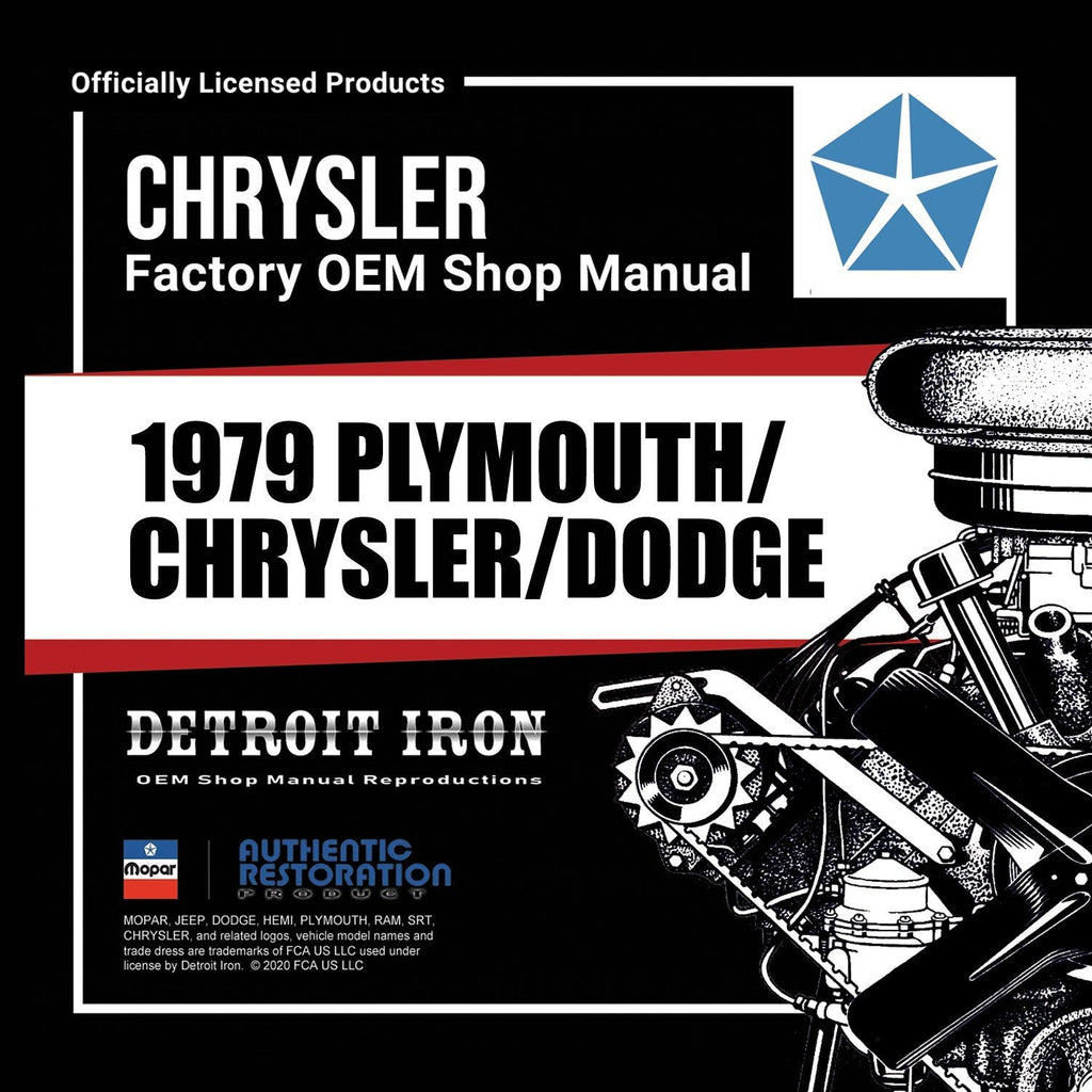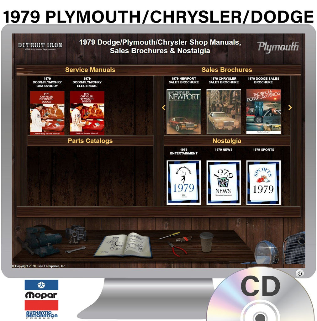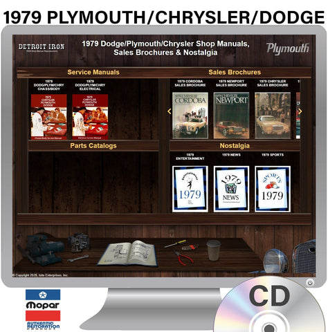 The 1979 Plymouth Chrysler Dodge Shop Manuals & Sales Brochures on CD is a digital product published by Detroit Iron and licensed by Chrysler. This Detroit Iron digital product provides a full set of original equipment manufacturer (OEM) repair and rebuild literature in digital / PDF format. This set of manuals and literature were originally authored and published by the car / truck manufacturer to be used by their dealership mechanics so they are very comprehensive. It features an easy-to-use bookcase in a garage scene containing a set of PDF manuals, catalogs, brochures and nostalgia for a specific year, make and model range.