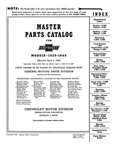 This 1929 - 1949 Chevrolet Master Parts (Six-Cylinder Models) Catalog is a high-quality, licensed PRINT reproduction of the parts catalog authored by General Motors Corporation and published by Detroit Iron. This new print manual is reproduced using the highest quality digital print equipment available - shrink-wrapped and ready to be shipped to your location. This OEM factory manual is 8.5 x 11 inches, paperback bound, shrink-wrapped and contains 782 pages of detailed parts information via exploded diagram cutouts of sections of your vehicle assembly with parts numbers and textual descriptions. A parts guide provides part interchange information so you can find replacement parts. The part book sections usually include: suspension, engine, transmission, body fittings/parts, brakes, cooling / radiator, exhaust, fenders, doors, fuel system, etc. Parts catalogs / books were originally published by the vehicle manufacturer to be used by their parts department and dealer mechanics.
