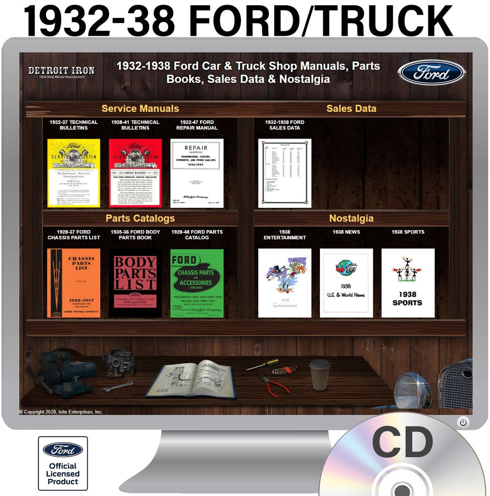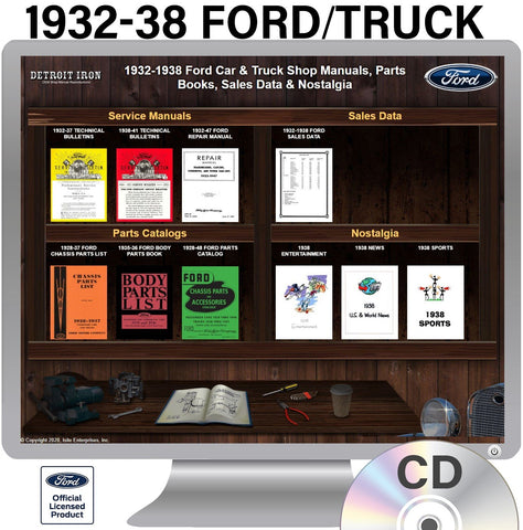 The 1932-1938 Ford Trucks and Cars Shop Manuals, Sales Data & Parts Books on USB is a digital product published by Detroit Iron and licensed by Ford. This Detroit Iron digital product provides a full set of original equipment manufacturer (OEM) repair and rebuild literature in digital / PDF format. This set of manuals and literature were originally authored and published by the car / truck manufacturer to be used by their dealership mechanics so they are very comprehensive. It features an easy-to-use bookcase in a garage scene containing a set of PDF manuals, catalogs, brochures and nostalgia for a specific year, make and model range.