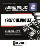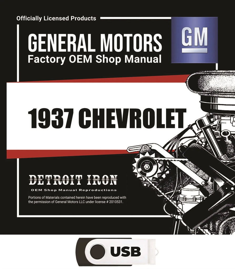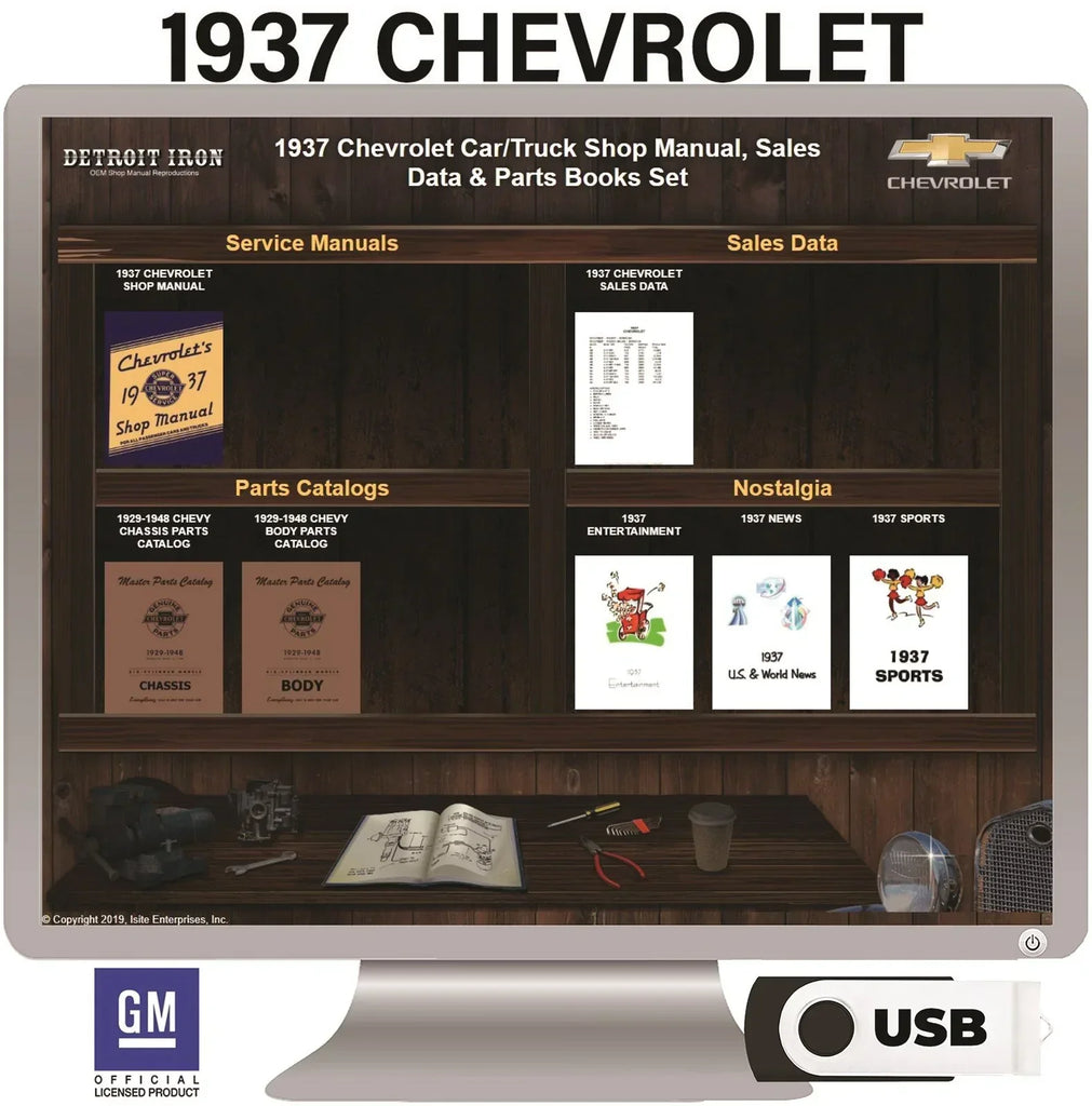 The 1937 Chevrolet Truck and Car Shop Manual, Sales Data & Parts Books on USB is a digital product published by Detroit Iron and licensed by GM. This Detroit Iron digital product provides a full set of original equipment manufacturer (OEM) repair and rebuild literature in digital / PDF format. This set of manuals and literature were originally authored and published by the car / truck manufacturer to be used by their dealership mechanics so they are very comprehensive. It features an easy-to-use bookcase in a garage scene containing a set of PDF manuals, catalogs, brochures and nostalgia for a specific year, make and model range.
