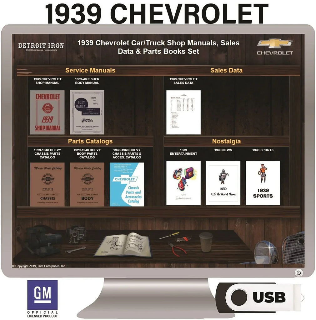 The 1939 Chevrolet Truck and Car Shop Manuals, Sales Data & Parts Books on USB is a digital product published by Detroit Iron and licensed by GM. This Detroit Iron digital product provides a full set of original equipment manufacturer (OEM) repair and rebuild literature in digital / PDF format. This set of manuals and literature were originally authored and published by the car / truck manufacturer to be used by their dealership mechanics so they are very comprehensive. It features an easy-to-use bookcase in a garage scene containing a set of PDF manuals, catalogs, brochures and nostalgia for a specific year, make and model range.