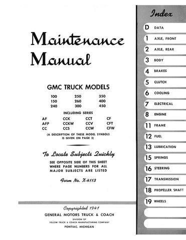 With the 1941 - 1942 GMC Truck 100-450 Maintenance Manual in your toolbox, you have the most comprehensive literature at your fingertips to take on the most challenging repair, service and restoration projects. This factory-written Detroit Iron shop manual is perfect for the restorer or anyone working on one of these vehicles.