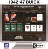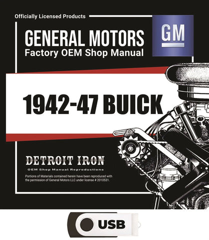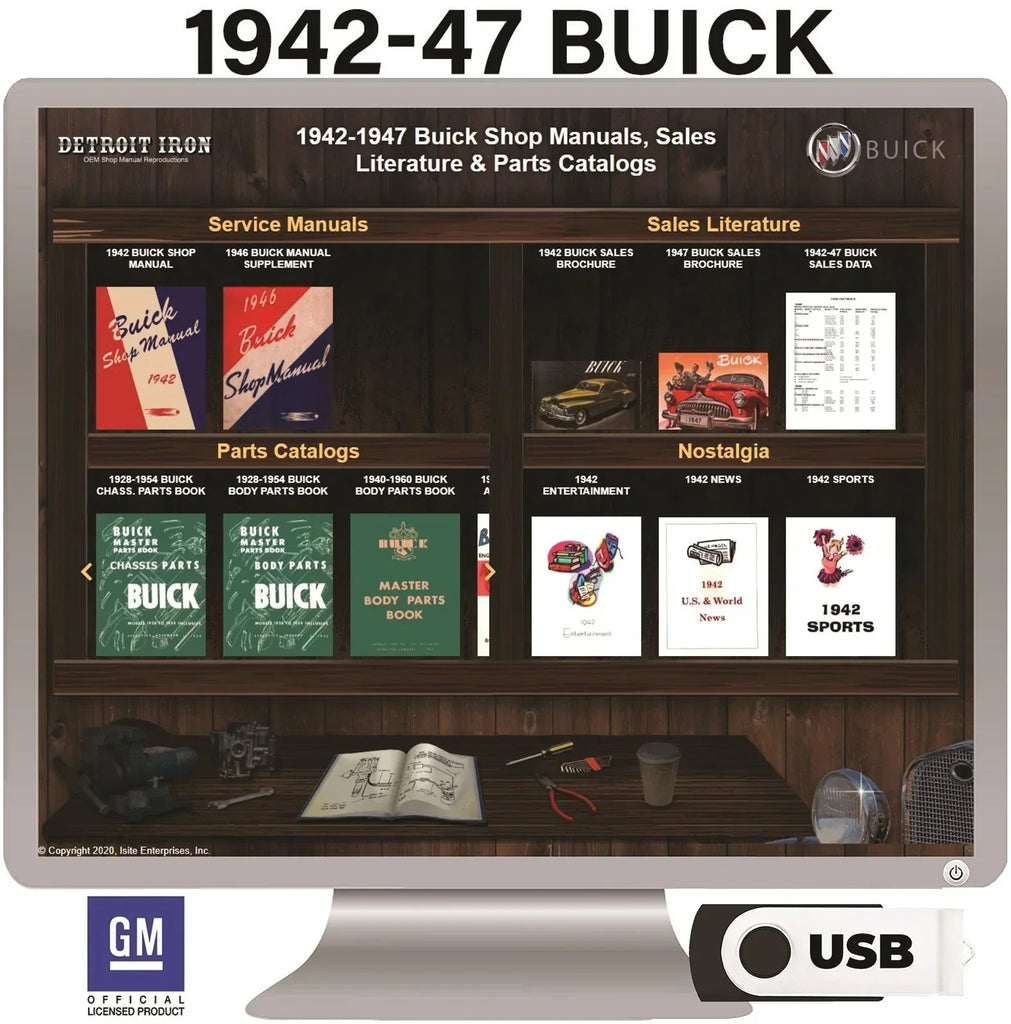The 1942-1947 Buick Shop Manuals, Parts Books & Sales Literature on USB is a digital product published by Detroit Iron and licensed by GM. This Detroit Iron digital product provides a full set of original equipment manufacturer (OEM) repair and rebuild literature in digital / PDF format. This set of manuals and literature were originally authored and published by the car / truck manufacturer to be used by their dealership mechanics so they are very comprehensive. It features an easy-to-use bookcase in a garage scene containing a set of PDF manuals, catalogs, brochures and nostalgia for a specific year, make and model range.