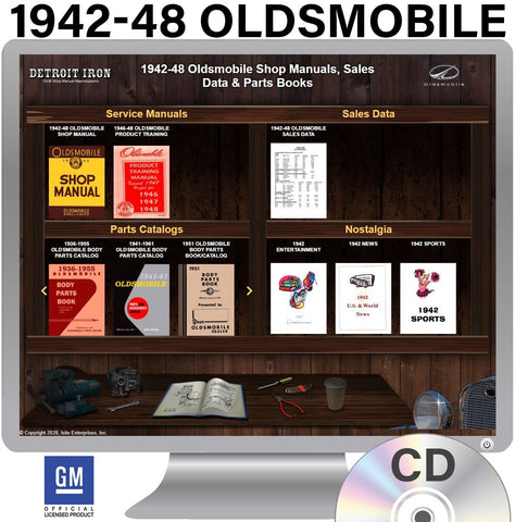 The 1942-1948 Oldsmobile Shop Manuals, Sales Data & Parts Books on CD is a digital product published by Detroit Iron and licensed by GM. This Detroit Iron digital product provides a full set of original equipment manufacturer (OEM) repair and rebuild literature in digital / PDF format. This set of manuals and literature were originally authored and published by the car / truck manufacturer to be used by their dealership mechanics so they are very comprehensive. It features an easy-to-use bookcase in a garage scene containing a seto of PDF manuals, catalogs, brochures and nostalgia for a specific year, make and model range.
