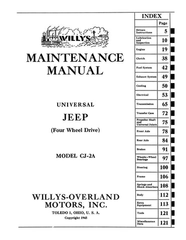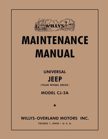 With the 1945 - 1949 Jeep Willys CJ-2A Maintenance Manual in your toolbox, you have the most comprehensive literature at your fingertips to take on the most challenging repair, service and restoration projects. This factory-written Detroit Iron shop manual is perfect for the restorer or anyone working on one of these vehicles.