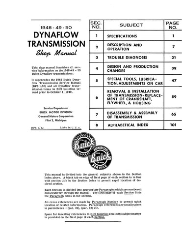 This 1948 - 1950 Buick Dynaflow Transmission Shop Manual is a high-quality, licensed PRINT reproduction of the service manual authored by Buick Motor Company and published by Detroit Iron. This new print manual is reproduced using the highest quality digital print equipment available - shrink wrapped and ready to be shipped to your location. This OEM factory manual is 8.5 x 11 inches, paperback bound, shrink-wrapped and contains 104 pages of comprehensive mechanical instructions with detailed diagrams, photos, and specifications for the mechanical components of your vehicle's dynaflow transmission system. Service/repair manuals were originally written by the automotive manufacturer to be used by their dealership mechanics.