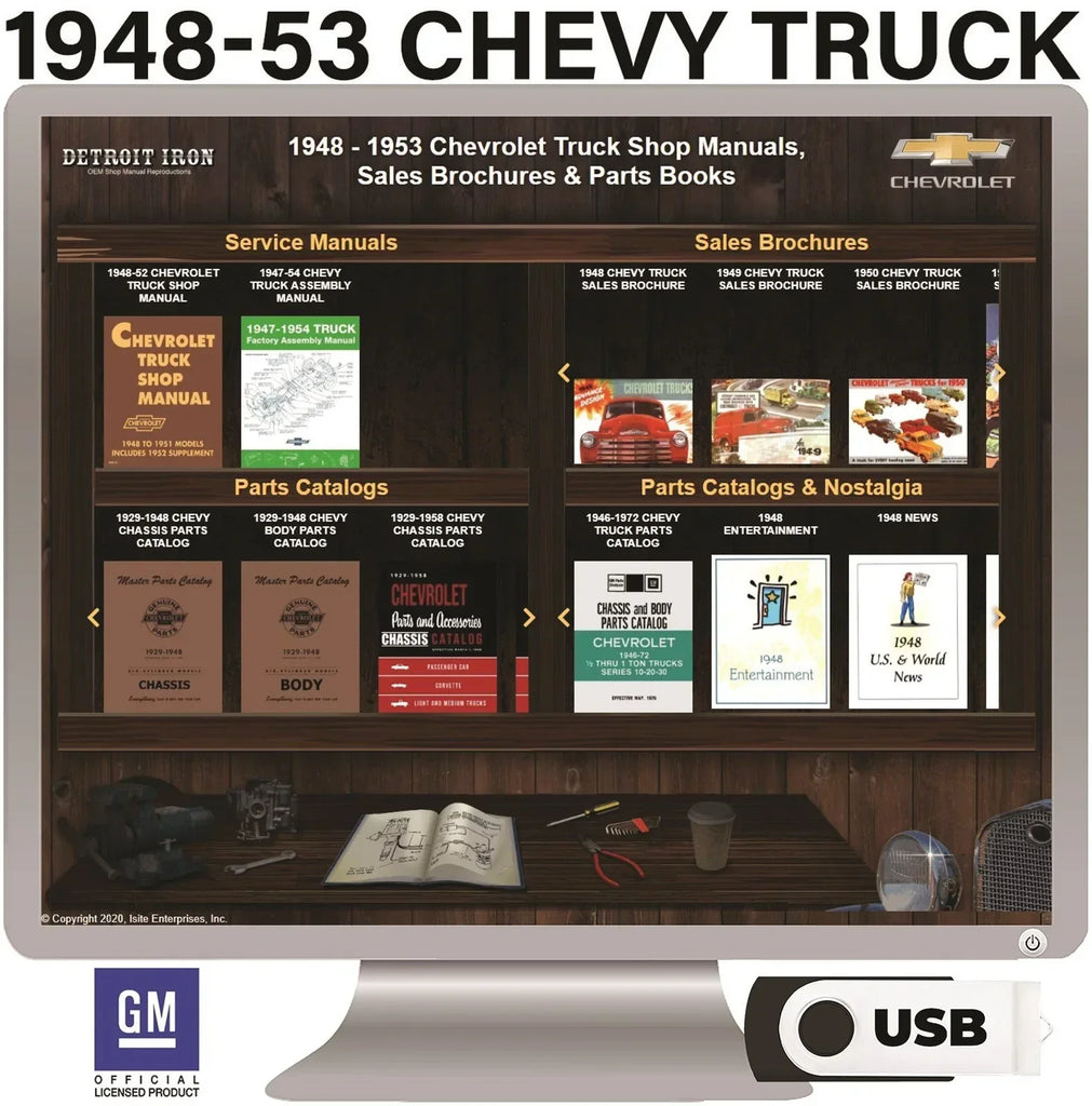 The 1948-1953 Chevrolet Truck Shop Manuals, Sales Brochures & Parts Books on USB is a digital product published by Detroit Iron and licensed by GM. This Detroit Iron digital product provides a full set of original equipment manufacturer (OEM) repair and rebuild literature in digital / PDF format. This set of manuals and literature were originally authored and published by the car / truck manufacturer to be used by their dealership mechanics so they are very comprehensive. It features an easy-to-use bookcase in a garage scene containing a set of PDF manuals, catalogs, brochures and nostalgia for a specific year, make and model range.