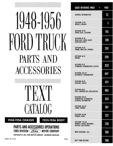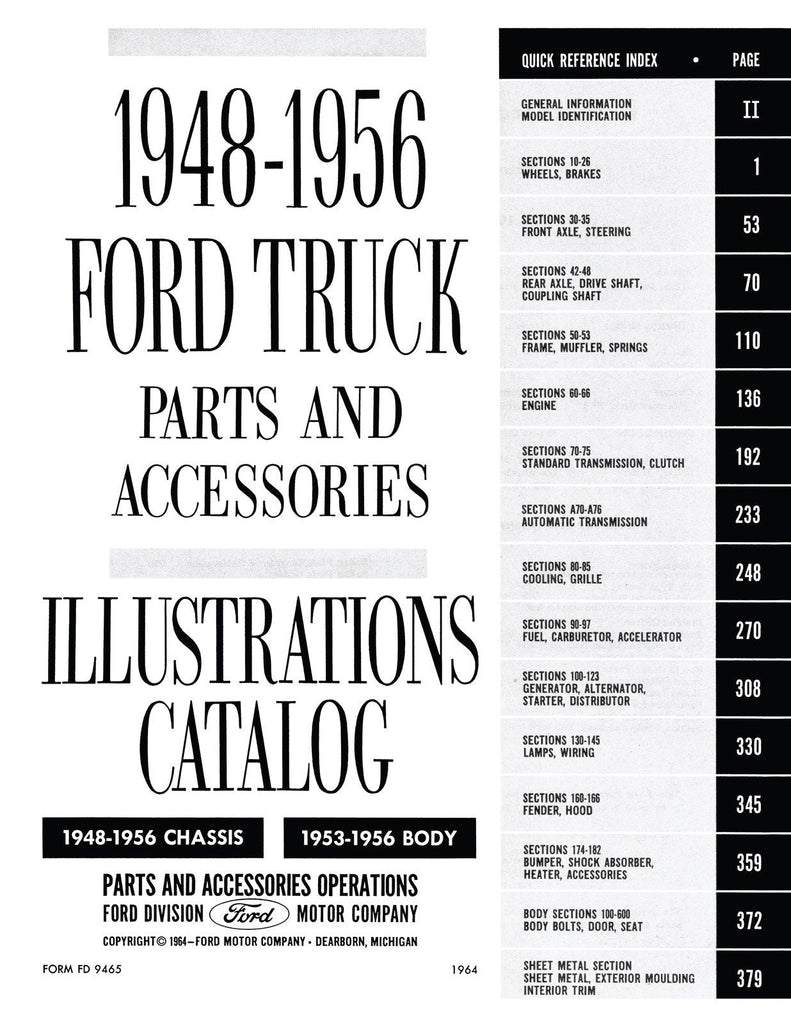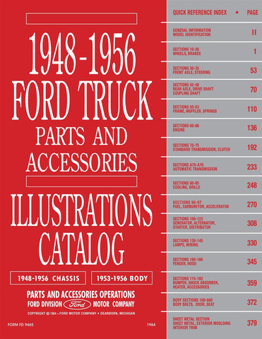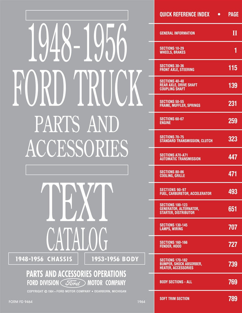 With the 1948 - 1956 Ford Truck Parts & Accessories Catalog Set in your toolbox, you have the most comprehensive literature at your fingertips to take on the most challenging repair, service and restoration projects. This factory-written Detroit Iron shop manual is perfect for the restorer or anyone working on one of these vehicles.