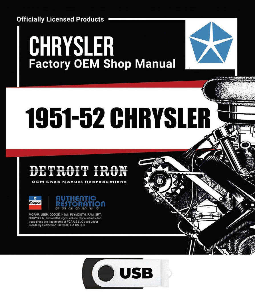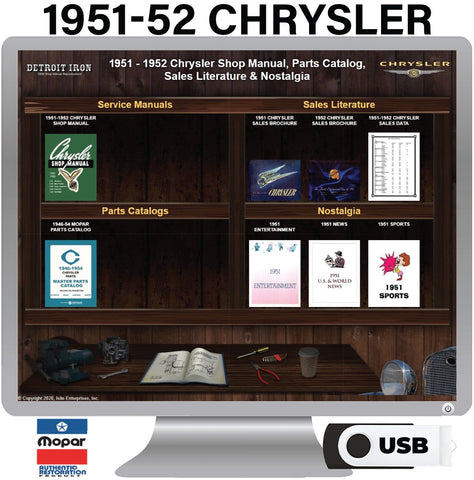The 1951-1952 Chrysler Shop Manual, Parts Catalog & Sales Literature on USB is a digital product published by Detroit Iron and licensed by Chrysler. This Detroit Iron digital product provides a full set of original equipment manufacturer (OEM) repair and rebuild literature in digital / PDF format. This set of manuals and literature were originally authored and published by the car / truck manufacturer to be used by their dealership mechanics so they are very comprehensive. It features an easy-to-use bookcase in a garage scene containing a set of PDF manuals, catalogs, brochures and nostalgia for a specific year, make and model range.