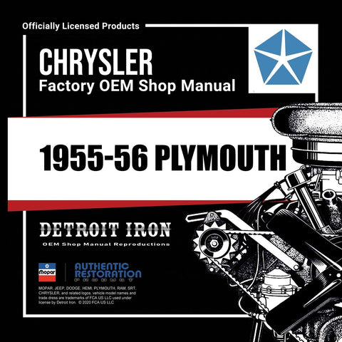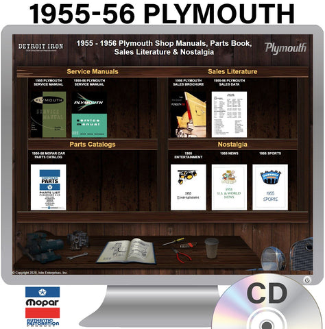 The 1955-1956 Plymouth Shop Manuals, Sales Literature & Parts Book on CD is a digital product published by Detroit Iron and licensed by Chrysler. This Detroit Iron digital product provides a full set of original equipment manufacturer (OEM) repair and rebuild literature in digital / PDF format. This set of manuals and literature were originally authored and published by the car / truck manufacturer to be used by their dealership mechanics so they are very comprehensive. It features an easy-to-use bookcase in a garage scene containing a set of PDF manuals, catalogs, brochures and nostalgia for a specific year, make and model range.