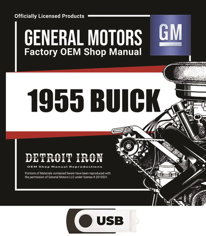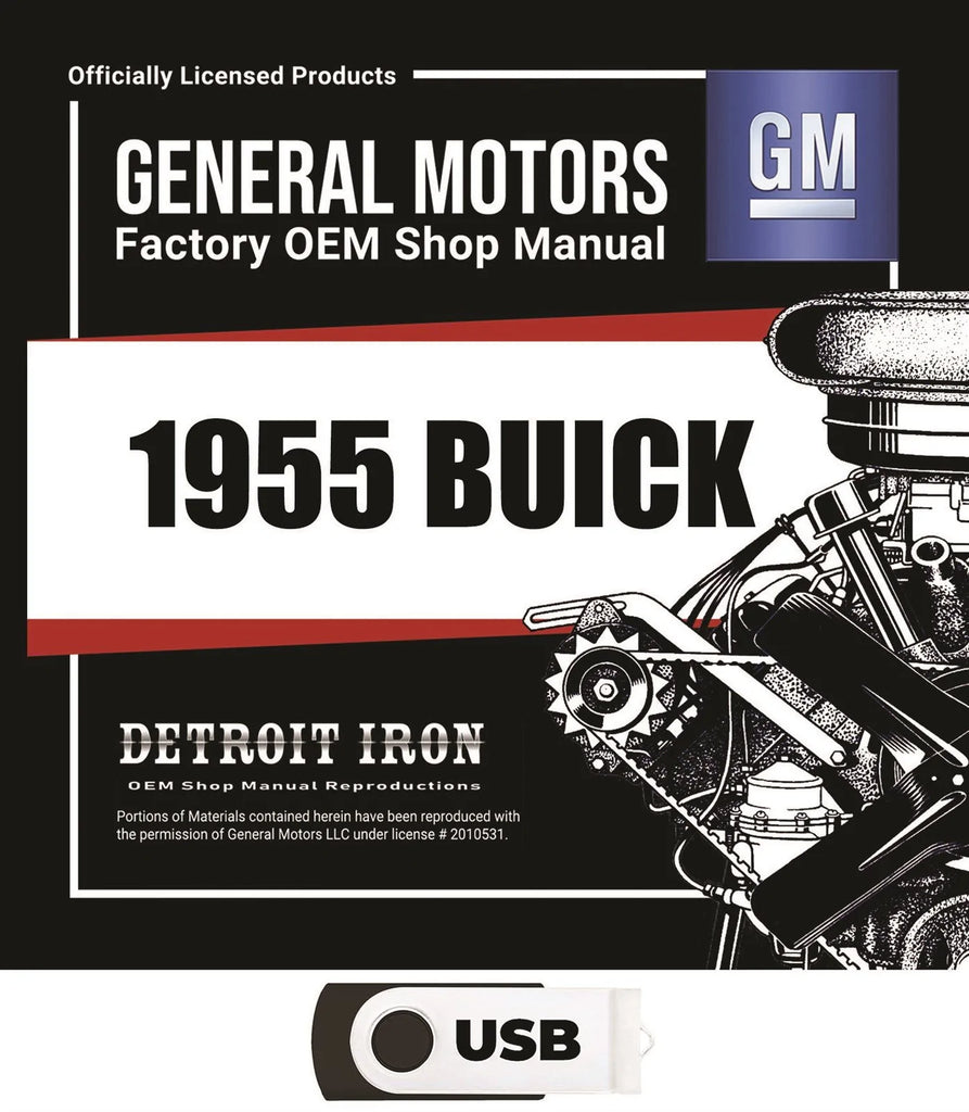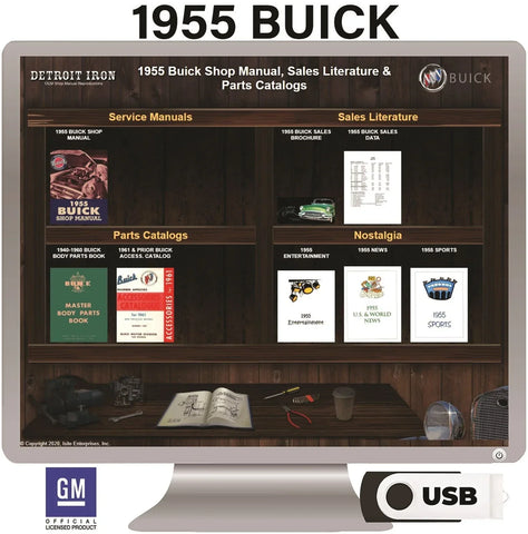The 1955 Buick Shop Manual, Parts Books & Sales Literature on USB is a digital product published by Detroit Iron and licensed by GM. This Detroit Iron digital product provides a full set of original equipment manufacturer (OEM) repair and rebuild literature in digital / PDF format. This set of manuals and literature were originally authored and published by the car / truck manufacturer to be used by their dealership mechanics so they are very comprehensive. It features an easy-to-use bookcase in a garage scene containing a set of PDF manuals, catalogs, brochures and nostalgia for a specific year, make and model range.