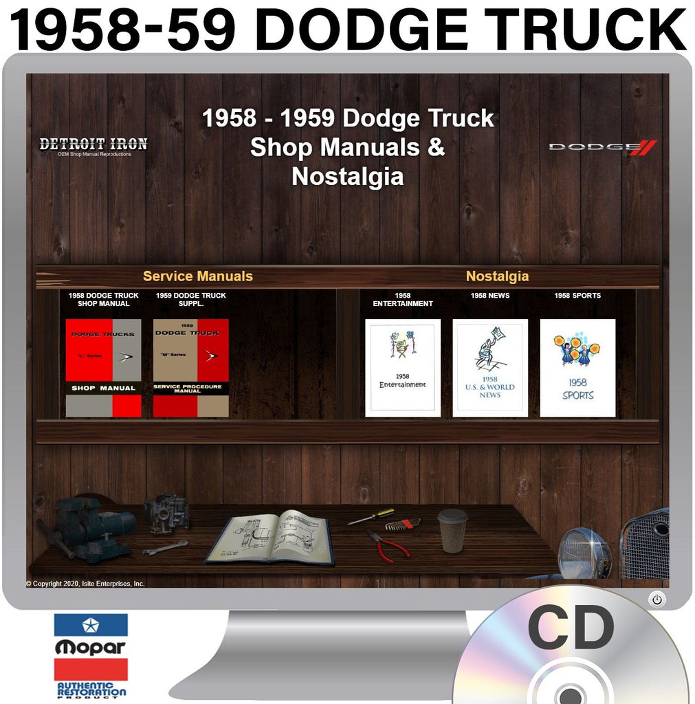 The 1958-1959 Dodge Truck Shop Manuals on CD is a digital product published by Detroit Iron and licensed by Chrysler. This Detroit Iron digital product provides a full set of original equipment manufacturer (OEM) repair and rebuild literature in digital / PDF format. This set of manuals and literature were originally authored and published by the car / truck manufacturer to be used by their dealership mechanics so they are very comprehensive. It features an easy-to-use bookcase in a garage scene containing a set of PDF manuals, catalogs, brochures and nostalgia for a specific year, make and model range.