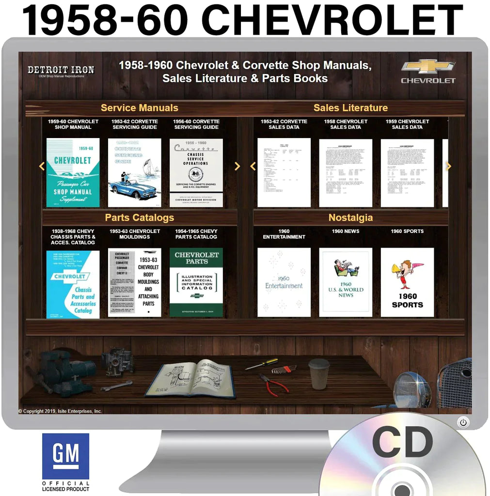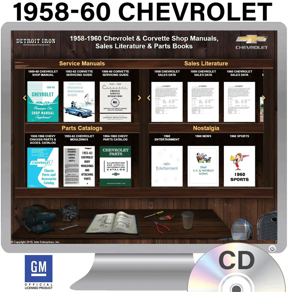 The 1958-1960 Chevrolet & Corvette Shop Manuals, Sales Literature & Parts Books on CD is a digital product published by Detroit Iron and licensed by GM. This Detroit Iron digital product provides a full set of original equipment manufacturer (OEM) repair and rebuild literature in digital / PDF format. This set of manuals and literature were originally authored and published by the car / truck manufacturer to be used by their dealership mechanics so they are very comprehensive. It features an easy-to-use bookcase in a garage scene containing a seto of PDF manuals, catalogs, brochures and nostalgia for a specific year, make and model range.