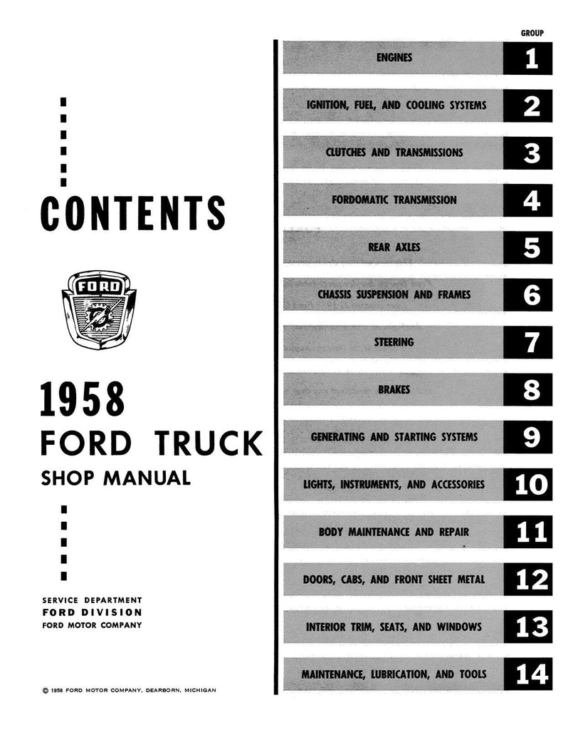 With the 1958 Ford Truck Shop Manual in your toolbox, you have the most comprehensive literature at your fingertips to take on the most challenging repair, service and restoration projects. This factory-written Detroit Iron shop manual is perfect for the restorer or anyone working on one of these vehicles.