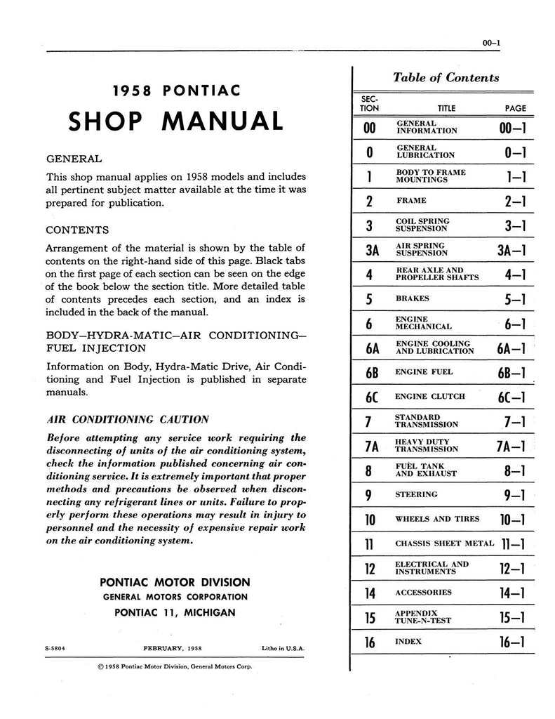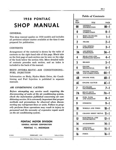 With the 1958 Pontiac Shop Manual in your toolbox, you have the most comprehensive literature at your fingertips to take on the most challenging repair, service and restoration projects. This factory written Detroit Iron shop manual is perfect for the restorer or anyone working on one of these vehicles.