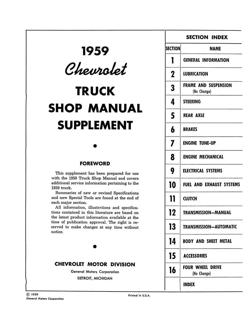 With the 1959 Chevy Truck Shop Manual Supplement in your toolbox, you have the most comprehensive literature at your fingertips to take on the most challenging repair, service and restoration projects. This factory written Detroit Iron shop manual is perfect for the restorer or anyone working on one of these vehicles.