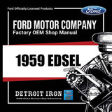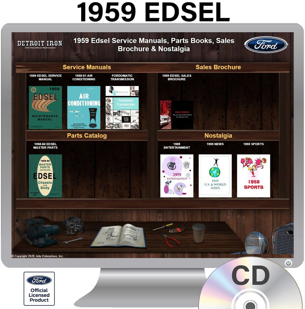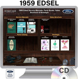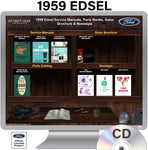 The 1959 Edsel Service Manuals, Sales Literature & Parts Book on CD is a digital product published by Detroit Iron and licensed by Ford. This Detroit Iron digital product provides a full set of original equipment manufacturer (OEM) repair and rebuild literature in digital / PDF format. This set of manuals and literature were originally authored and published by the car / truck manufacturer to be used by their dealership mechanics so they are very comprehensive. It features an easy-to-use bookcase in a garage scene containing a set of PDF manuals, catalogs, brochures and nostalgia for a specific year, make and model range.