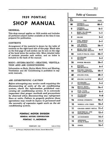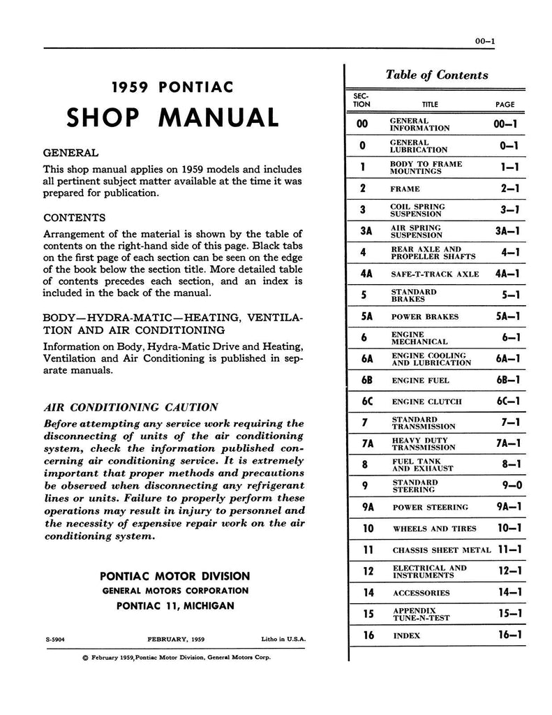 With the 1959 Pontiac Shop Manual in your toolbox, you have the most comprehensive literature at your fingertips to take on the most challenging repair, service and restoration projects. This factory written Detroit Iron shop manual is perfect for the restorer or anyone working on one of these vehicles.