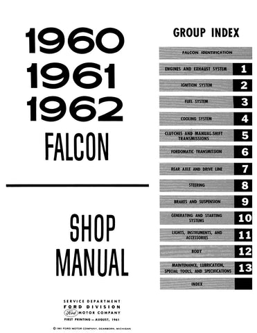 With the 1960 - 1961 - 1962 Ford Falcon Shop Manual in your toolbox, you have the most comprehensive literature at your fingertips to take on the most challenging repair, service and restoration projects. This factory-written Detroit Iron shop manual is perfect for the restorer or anyone working on one of these vehicles.