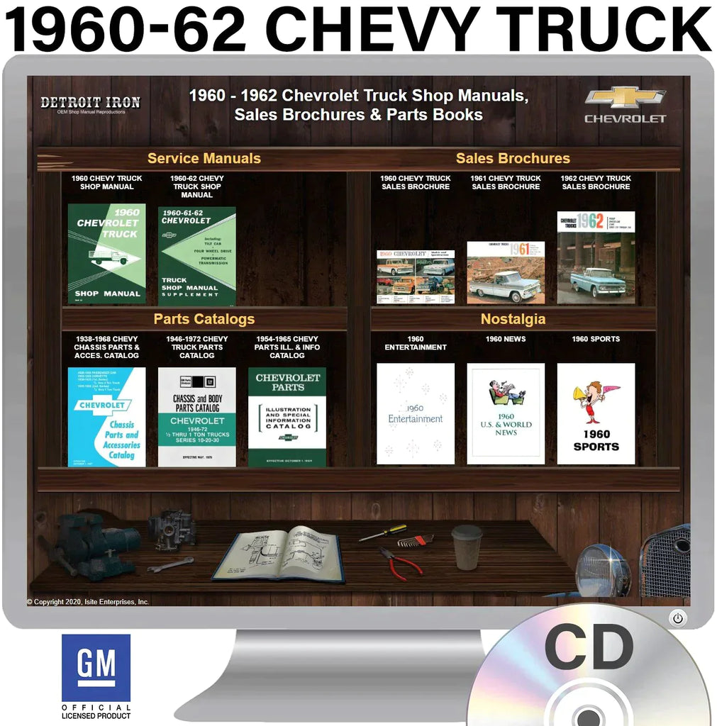 The 1960-1962 Chevrolet Truck Shop Manuals, Sales Brochures & Parts Books on CD is a digital product published by Detroit Iron and licensed by GM. This Detroit Iron digital product provides a full set of original equipment manufacturer (OEM) repair and rebuild literature in digital / PDF format. This set of manuals and literature were originally authored and published by the car / truck manufacturer to be used by their dealership mechanics so they are very comprehensive. It features an easy-to-use bookcase in a garage scene containing a seto of PDF manuals, catalogs, brochures and nostalgia for a specific year, make and model range.