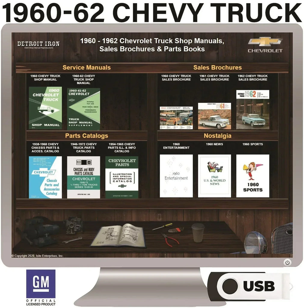 The 1960-1962 Chevrolet Truck Shop Manuals, Sales Brochures & Parts Books on USB is a digital product published by Detroit Iron and licensed by GM. This Detroit Iron digital product provides a full set of original equipment manufacturer (OEM) repair and rebuild literature in digital / PDF format. This set of manuals and literature were originally authored and published by the car / truck manufacturer to be used by their dealership mechanics so they are very comprehensive. It features an easy-to-use bookcase in a garage scene containing a set of PDF manuals, catalogs, brochures and nostalgia for a specific year, make and model range.