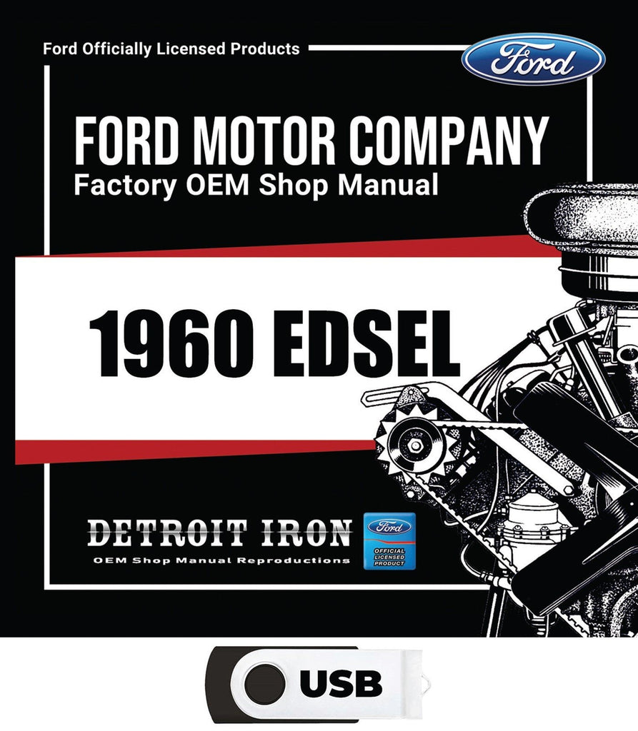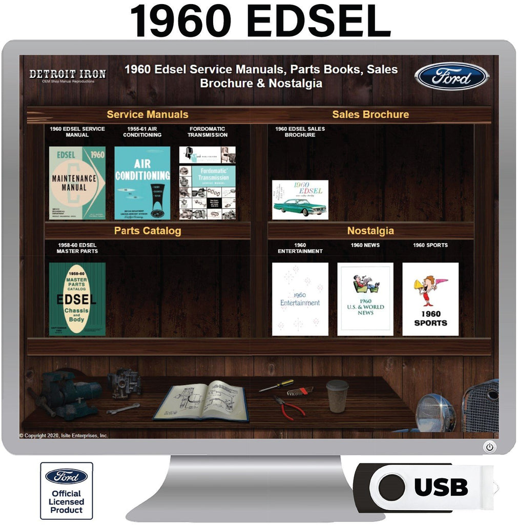 The 1960 Edsel Service Manuals, Sales Brochure & Parts Book on USB is a digital product published by Detroit Iron and licensed by Ford. This Detroit Iron digital product provides a full set of original equipment manufacturer (OEM) repair and rebuild literature in digital / PDF format. This set of manuals and literature were originally authored and published by the car / truck manufacturer to be used by their dealership mechanics so they are very comprehensive. It features an easy-to-use bookcase in a garage scene containing a set of PDF manuals, catalogs, brochures and nostalgia for a specific year, make and model range.