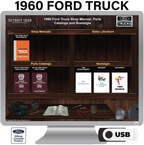 The 1960 Ford Truck Shop Manual & Parts Books on USB is a digital product published by Detroit Iron and licensed by Ford. This Detroit Iron digital product provides a full set of original equipment manufacturer (OEM) repair and rebuild literature in digital / PDF format. This set of manuals and literature were originally authored and published by the car / truck manufacturer to be used by their dealership mechanics so they are very comprehensive. It features an easy-to-use bookcase in a garage scene containing a set of PDF manuals, catalogs, brochures and nostalgia for a specific year, make and model range.