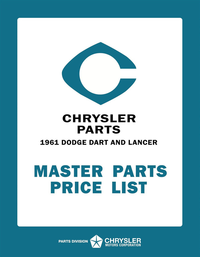 This 1961 Dodge Dart and Lancer Parts Catalog is a high-quality, licensed PRINT reproduction of the parts catalog authored by Chrysler Corporation and published by Detroit Iron. This new print manual is reproduced using the highest quality digital print equipment available - shrink wrapped and ready to be shipped to your location. This OEM factory manual is 8.5 x 11 inches, paperback bound, shrink-wrapped and contains 514 pages of detailed parts information via exploded diagram cutouts of sections of your vehicle assembly with parts numbers and textual descriptions. A parts guide provides part interchange information so you can find replacement parts. The part book sections usually include: suspension, engine, transmission, body fittings/parts, brakes, cooling / radiator, exhaust, fenders, doors, fuel system, etc. The following