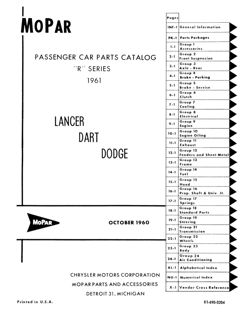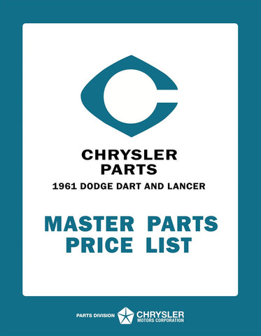 With the 1961 Dodge Dart and Lancer Parts Catalog in your toolbox, you have the most comprehensive literature at your fingertips to take on the most challenging repair, service and restoration projects. This factory written Detroit Iron shop manual is perfect for the restorer or anyone working on one of these vehicles.