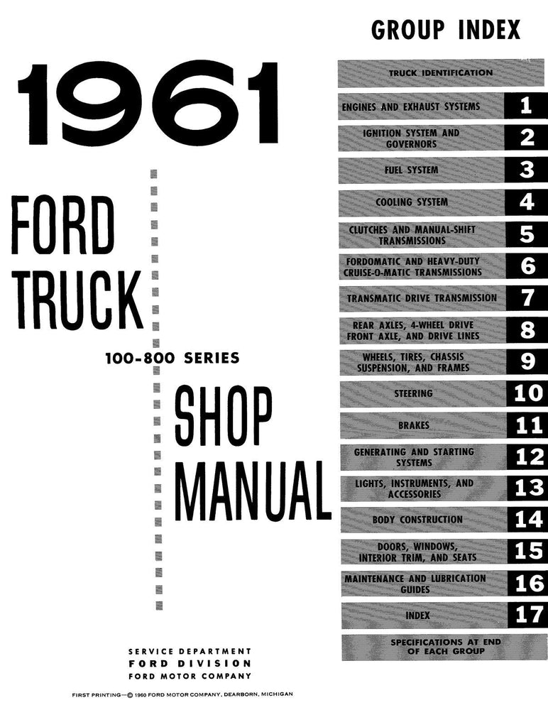 With the 1961 Ford Truck 100-800 Series Shop Manual in your toolbox, you have the most comprehensive literature at your fingertips to take on the most challenging repair, service and restoration projects. This factory-written Detroit Iron shop manual is perfect for the restorer or anyone working on one of these vehicles.