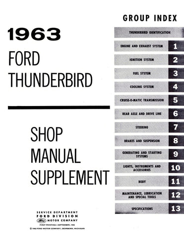 With the 1962 - 1963 Ford Thunderbird Shop Manual in your toolbox, you have the most comprehensive literature at your fingertips to take on the most challenging repair, service and restoration projects. This factory-written Detroit Iron shop manual is perfect for the restorer or anyone working on one of these vehicles.