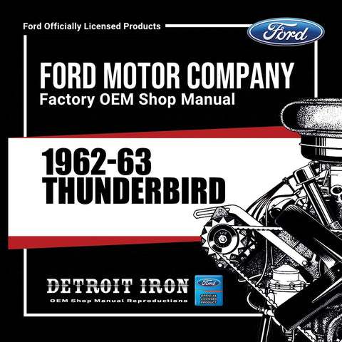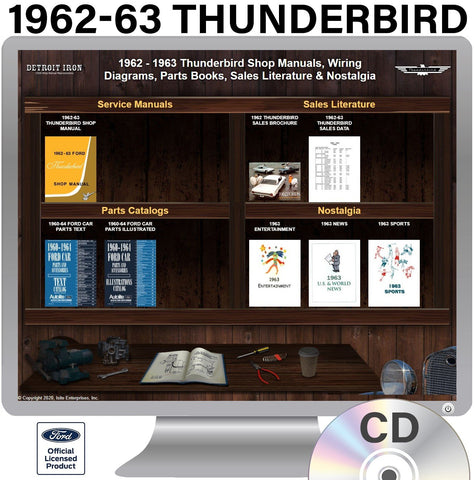 The 1962-1963 Thunderbird Shop Manual, Sales Literature & Parts Books on CD is a digital product published by Detroit Iron and licensed by Ford. This Detroit Iron digital product provides a full set of original equipment manufacturer (OEM) repair and rebuild literature in digital / PDF format. This set of manuals and literature were originally authored and published by the car / truck manufacturer to be used by their dealership mechanics so they are very comprehensive. It features an easy-to-use bookcase in a garage scene containing a set of PDF manuals, catalogs, brochures and nostalgia for a specific year, make and model range.
